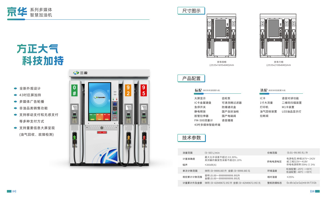 产品外观功能特点基于大数据的网络化信息化终端◎ 智能加油机已成为加油站联系客户的智能终端,与移动互联网、云计算、大数据、物联网等信息通讯技术相结合,从而帮助加油站进行用户分析,向客户提供创新的个性化服务,吸引新老客户,增加市场份额,提升加油站整体经营效果。 全油品支持◎ 三盈智胜系列多媒体智慧加油机配备多枪多油品,让客户能够任意选择自己需要的油品,使油站能够有序、高效地加油。单侧双加油位,满足两辆车同时加油◎ 三盈智胜系列多媒体智慧加油机单侧配置双操作和双主显示屏,每一个操作位可选任一油枪加油,满足两辆车同时加油,提高加油效率。广告宣传功能◎三盈智胜系列多媒体智慧加油机采用32吋的高亮、防眩室外高清触摸屏,具有广告视频播放功能。◎ 屏幕分区设计,加油的同时也不影响视频广告的播放,易于油站的宣传和展示。非油品类销售功能◎ 三盈智胜系...